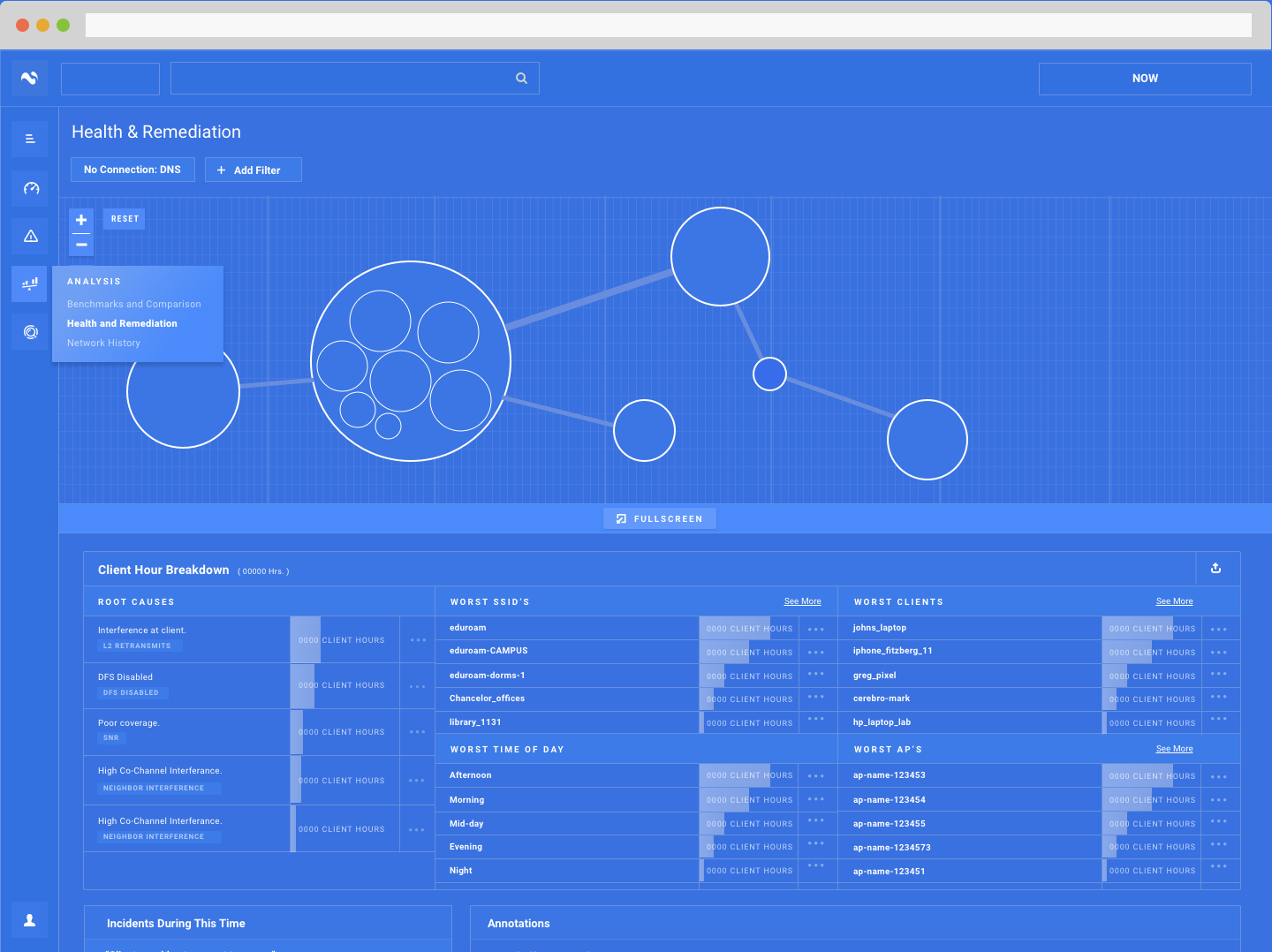 In our first pass, our main focus was on workflow follow-through above all else. We wanted to ensure users would not come to this section just to be left with another dead end. In short, we wanted to open doors on each page to further analysis, either in the same section or within the details of a client, access point, server, etc.