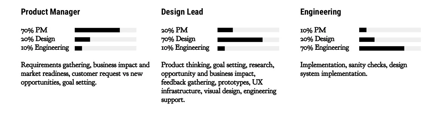 Given our size, many hats were worn and all voices were critical. Everyone participated in critiques and feedback, everyone participated in requirements gathering. Below is a breakdown of how I saw the split: